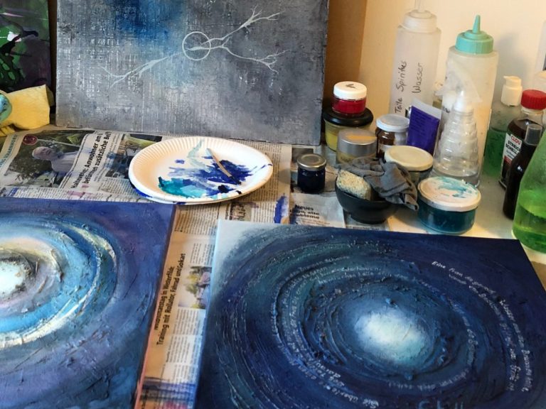 In meinen Arbeiten kommen Strukturen, Farben und Formen in bewegenden Arrangements zusammen. Bilder wie ein farbiges Kaleidoskop oder sehr zurückhaltend, wie ein Fenster ins Nichts; Schriftbilder geben der Fantalie Hinweise und konkrete Abbildungen aus der Natur.